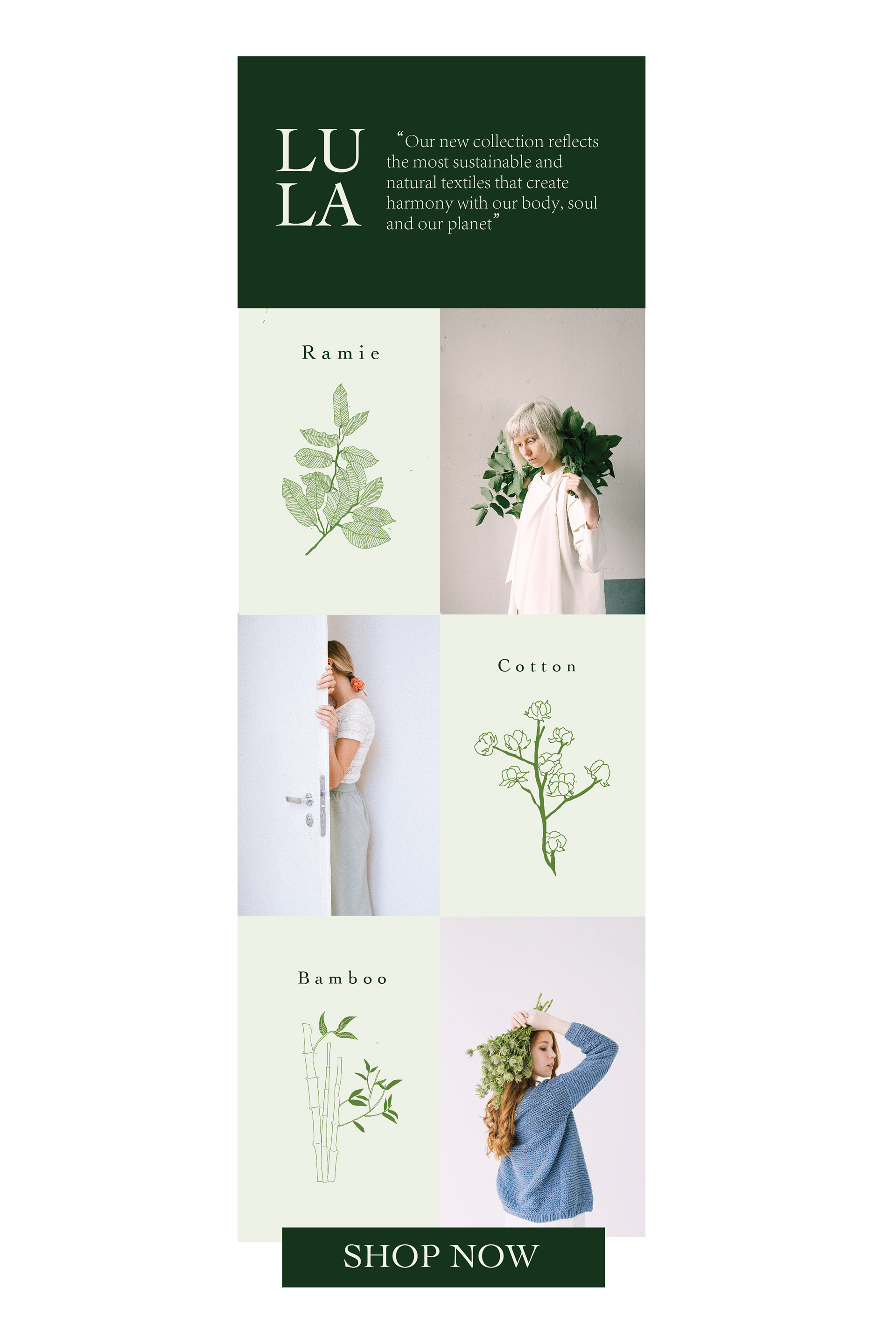 Concept Social assets for a new company named Lula, which uses only ethical materials. This minimalistic design is meant to convey an earthy, ethical and sustainable textile company.